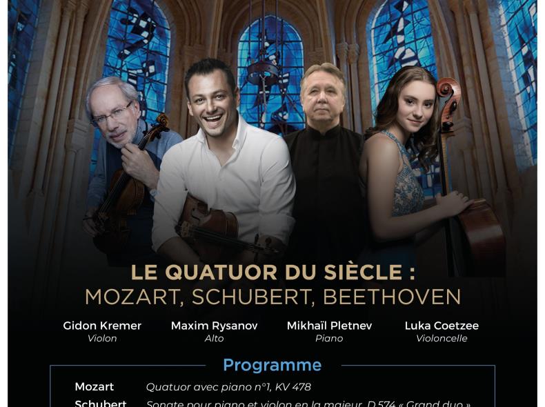 La Fondation Cziffra vous propose un quatuor de l'héritage Viennois avec des morceaux de Mozart, Schubert et Beethoven. Gidon Kremer au violon, Maxim Rysanov à l'alto, Luka Coetzee au violoncelle et Mikhaïl Pletnev au piano.