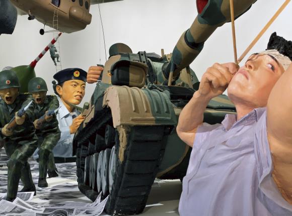 L’œuvre de Wang Du, composées de dix-sept sculptures en résine peinte alignées sur un podium de 12 m de long, prend sa source dans des images de presse ayant relayé diverses activités militaires. Chacune de ces sculptures est très littéralement une extension dans l’espace de l’une de ces images, les éléments sculptés respectant avec précision chaque rapport d’échelle, chaque cadrage d’origine.